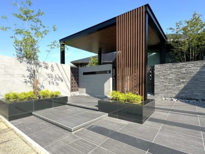 愛知県一宮市での新築外構事例です。LIXILエクステリアコンテスト2024「ファサード部門」で銀賞を受賞しています。