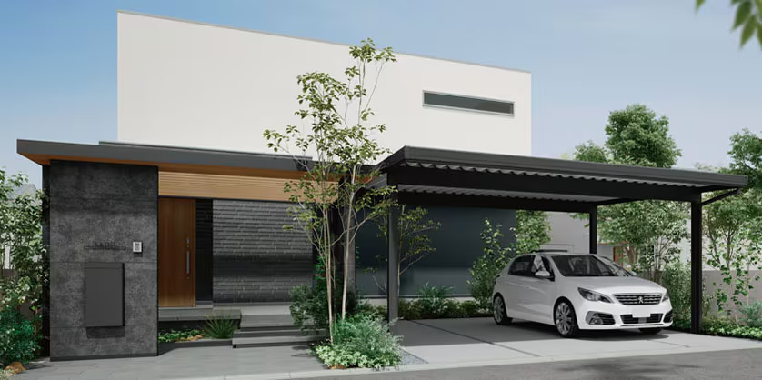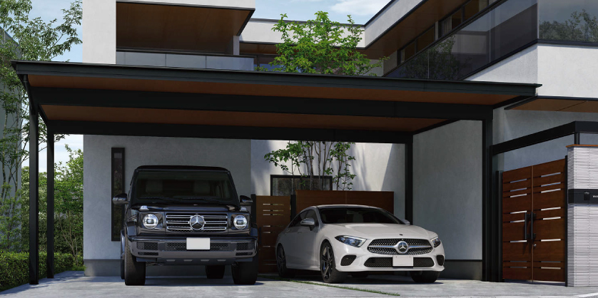敷地形状に合わせた特注デザイン、3台用以上の柱の少ない大きな屋根、カーポート兼バルコニー(屋上デッキ)など、こだわりを形にしやすい価格帯です。