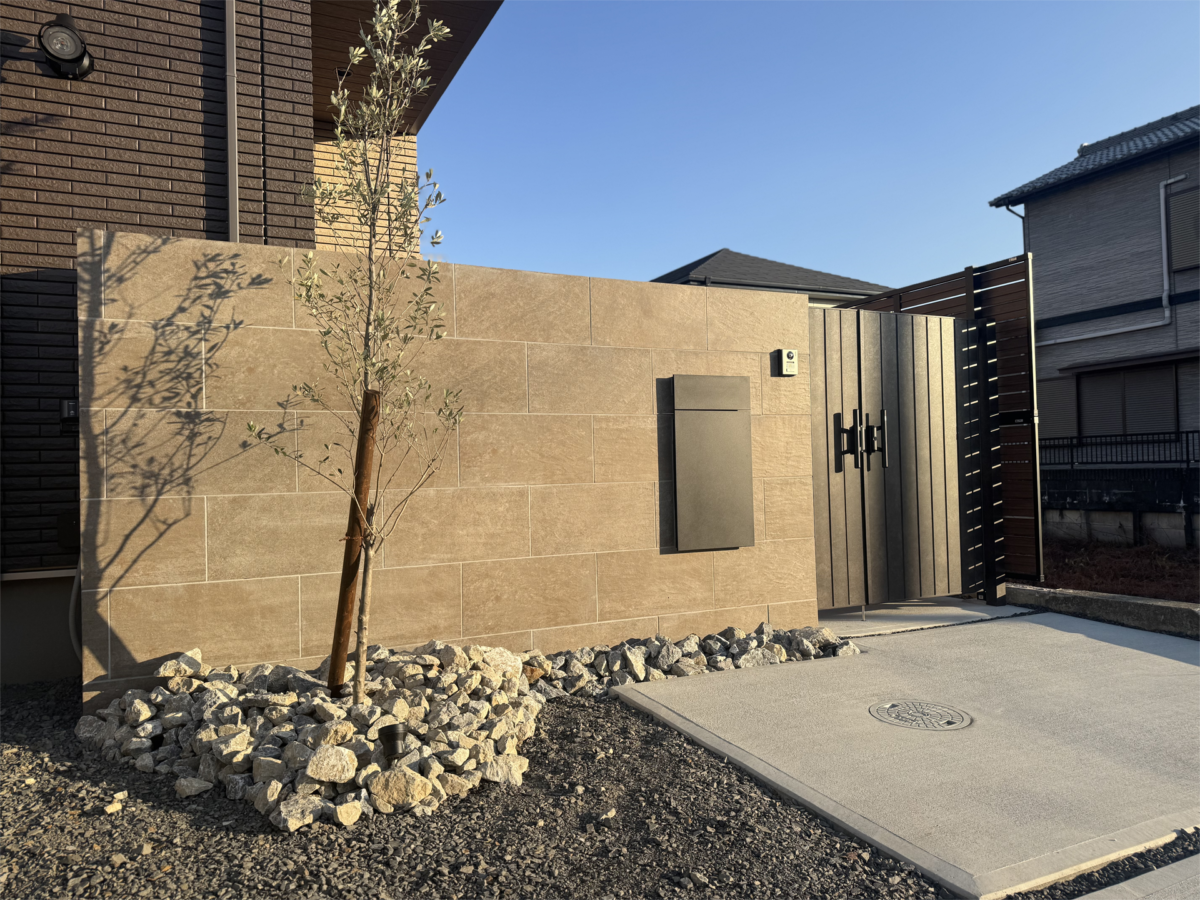 夜間はオリーブが照らされ、門袖まわりに陰影が生まれます。