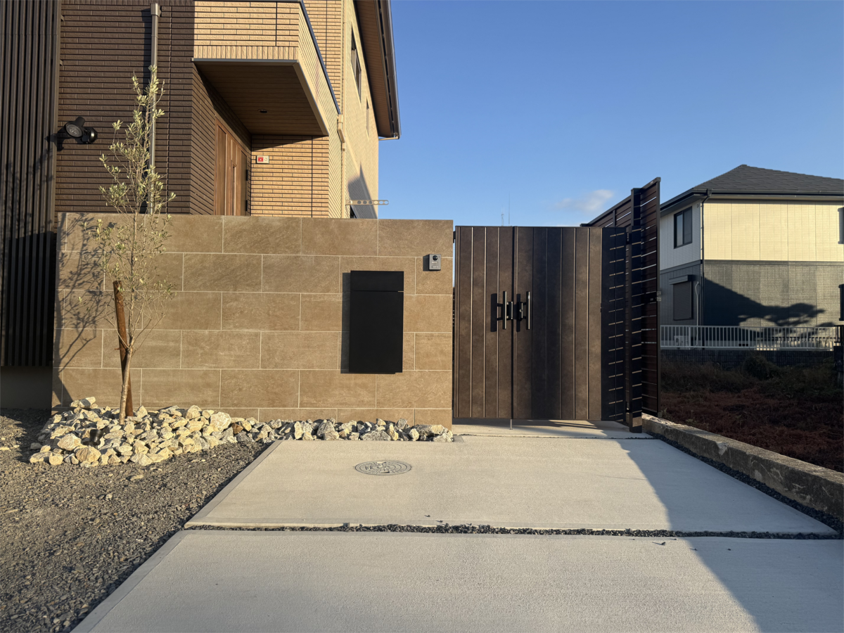 門まわりはタイル貼りの門袖と親子門扉で構成しています。