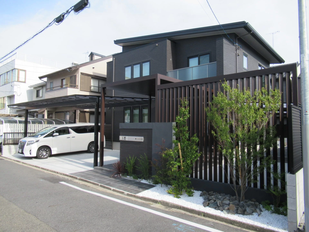 高低差がある現場でしたが、建物と調和するダークカラーで、洗練されたデザイン性と機能性を両立させた新築外構です。
