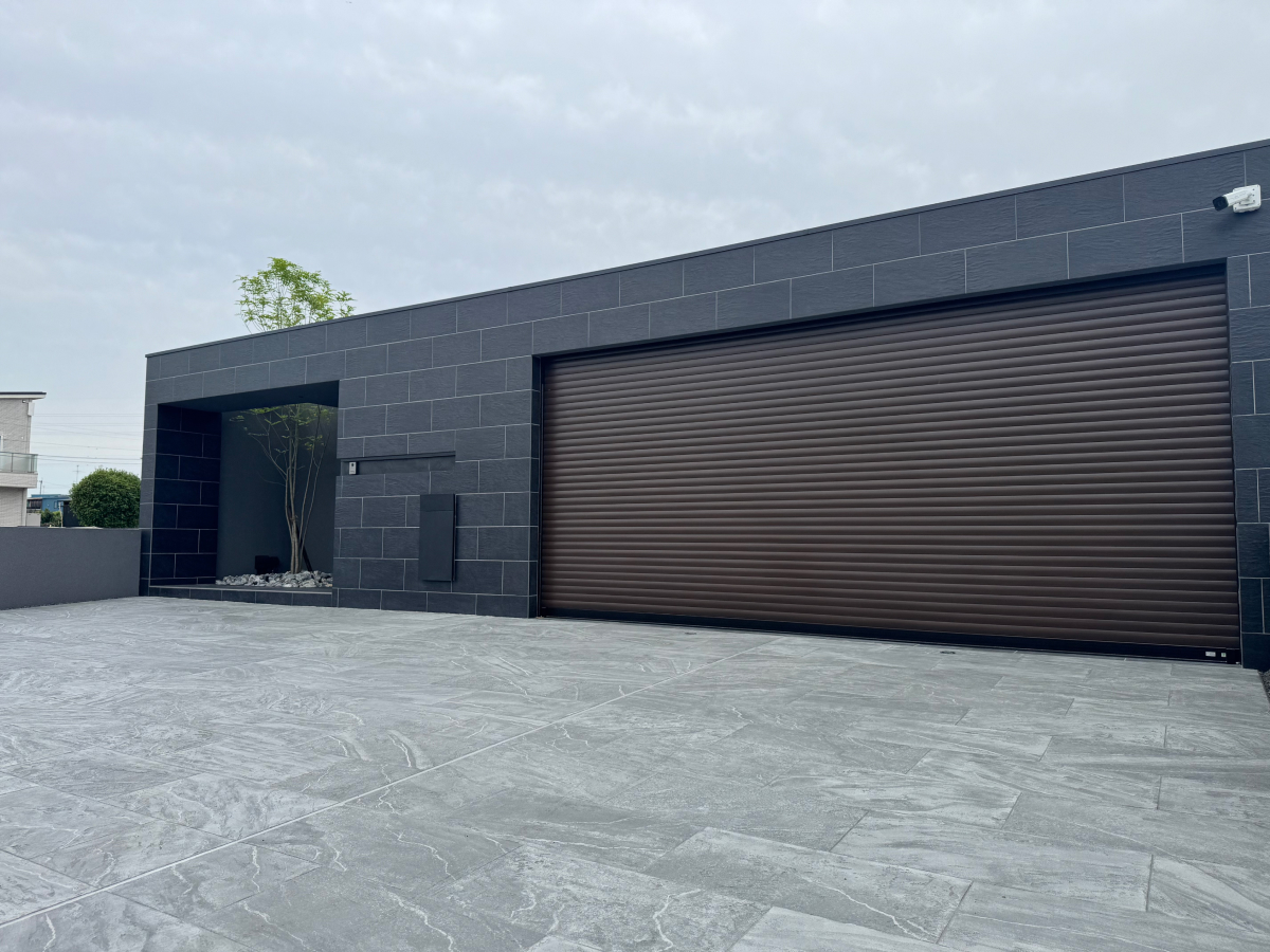 ゲートを閉めると、外からの視線を完全にシャットアウトするクローズ外構。ダークトーンでまとめた壁とシャッターが、重厚感とプライバシー性の高さを感じさせます。
